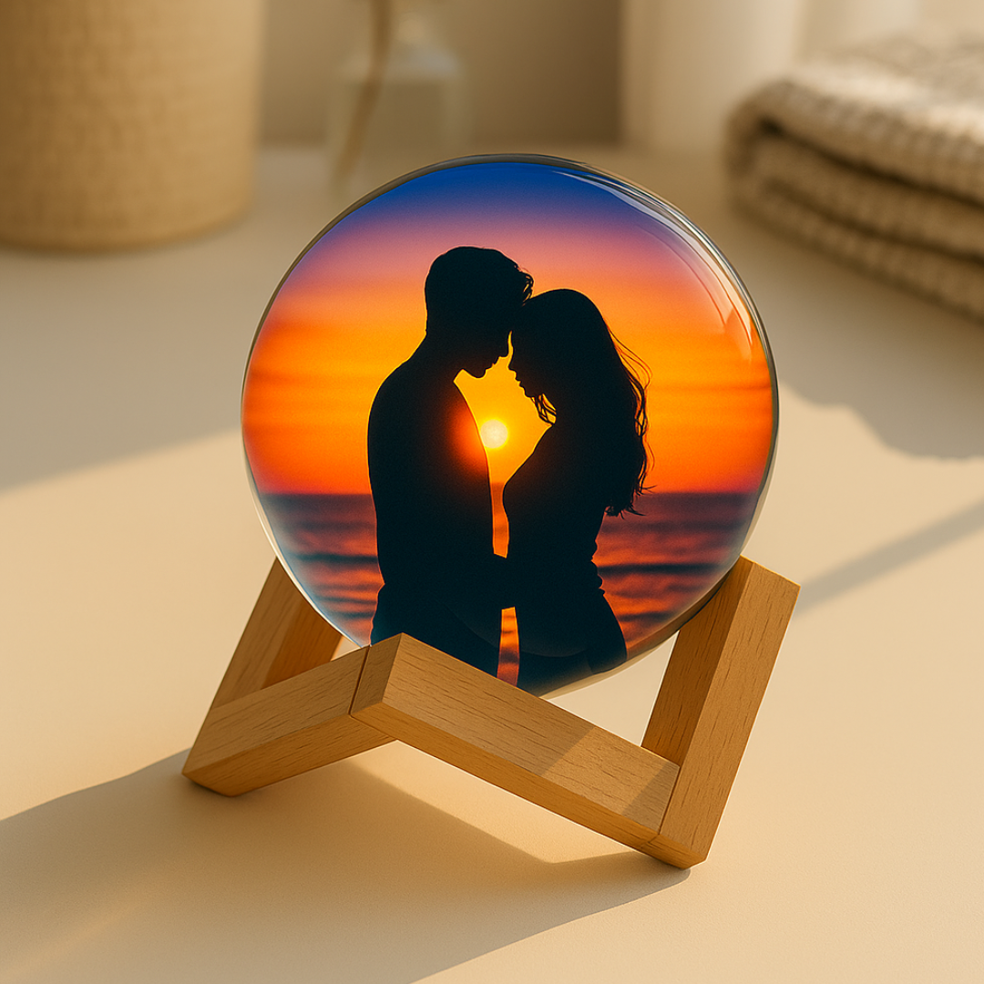 The Infinity Orb is a crystal ball with a built-in video player on the back. You upload your videos, and the orb projects them in 3D inside the crystal, creating a floating, immersive display of your memories.